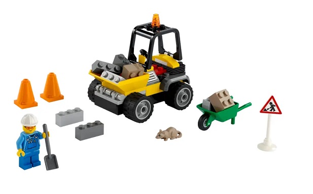 Sada Náklaďák silničářů (60284) od LEGO® City obsahuje nákladní vozík, kolečko, dopravní kužely, značku a lopatu. Navíc nechybí minifigurka silničáře a figurka krysy.